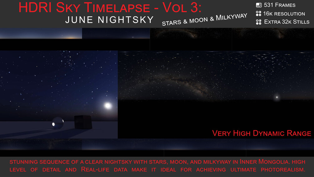Embark on a celestial journey with HDRI Sky Timelapse - Vol. 3: Nightsky (Stars, Moon, Milkyway). Immerse yourself in the mystical allure of a clear nightsky captured in Inner Mongolia through this hand-made timelapse consisting of an almost 9-hour sequence comprising 531 frames.