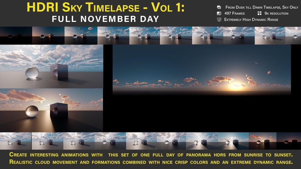 My HDRI sequences are carefully crafted to provide photorealistic and high resolution timelapses with either sunny and crisp or cloudy skies from sunrise to sunset. Craft into your renderings the beauty of each season in life-like clarity with this awesome asset.