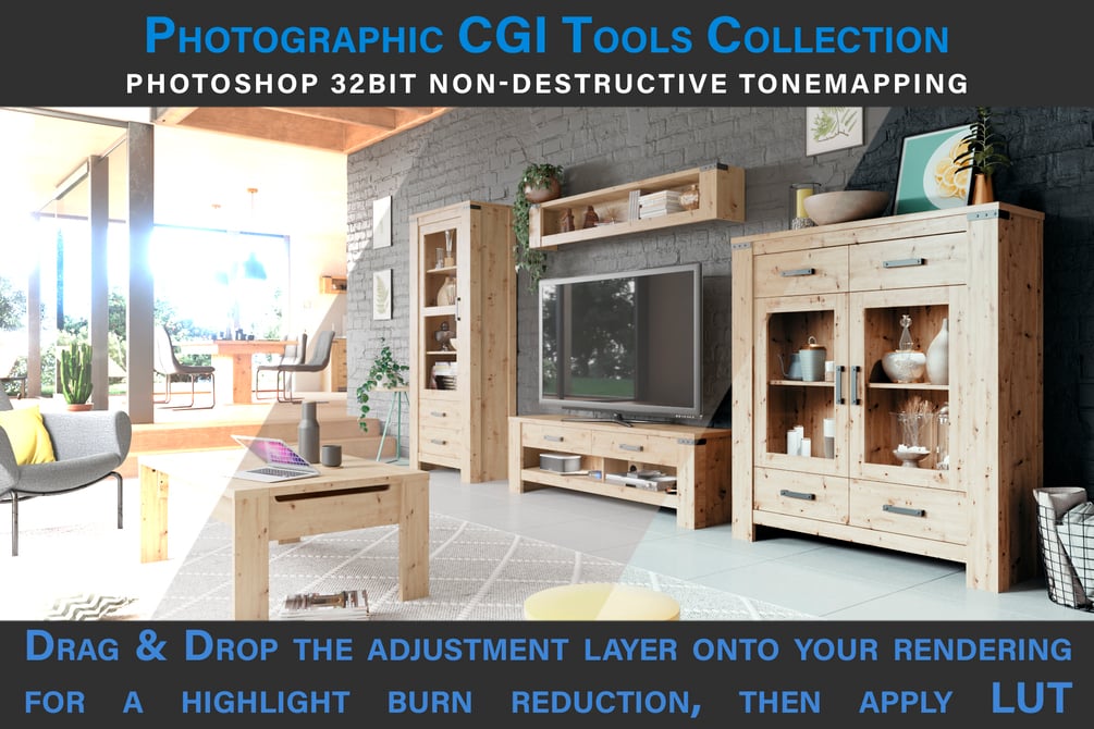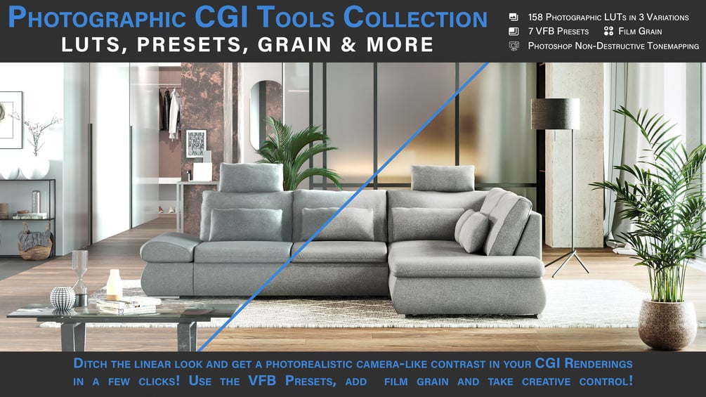 Just use one of the photographic LUTs or V-Ray VFB Presets from this collection to add a photographic touch!